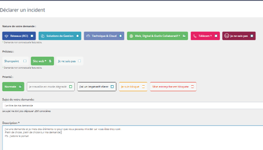 Pour déclarer un nouvel incident et créer un ticket (Problème sur votre PC, internet, accès répertoire, e-mails, pdf, etc…), il vous suffit de cliquer sur « déclarer un nouvel incident ». La page ci-dessous s’ouvrira et vous permettra de donner le plus d’informations possibles dans le but d’assurer la meilleure résolution du problème par les équipes OCI.